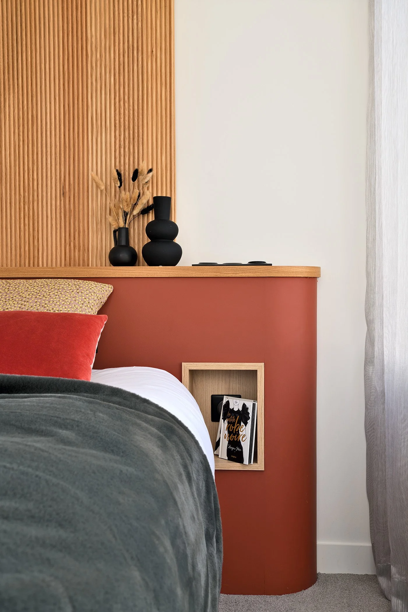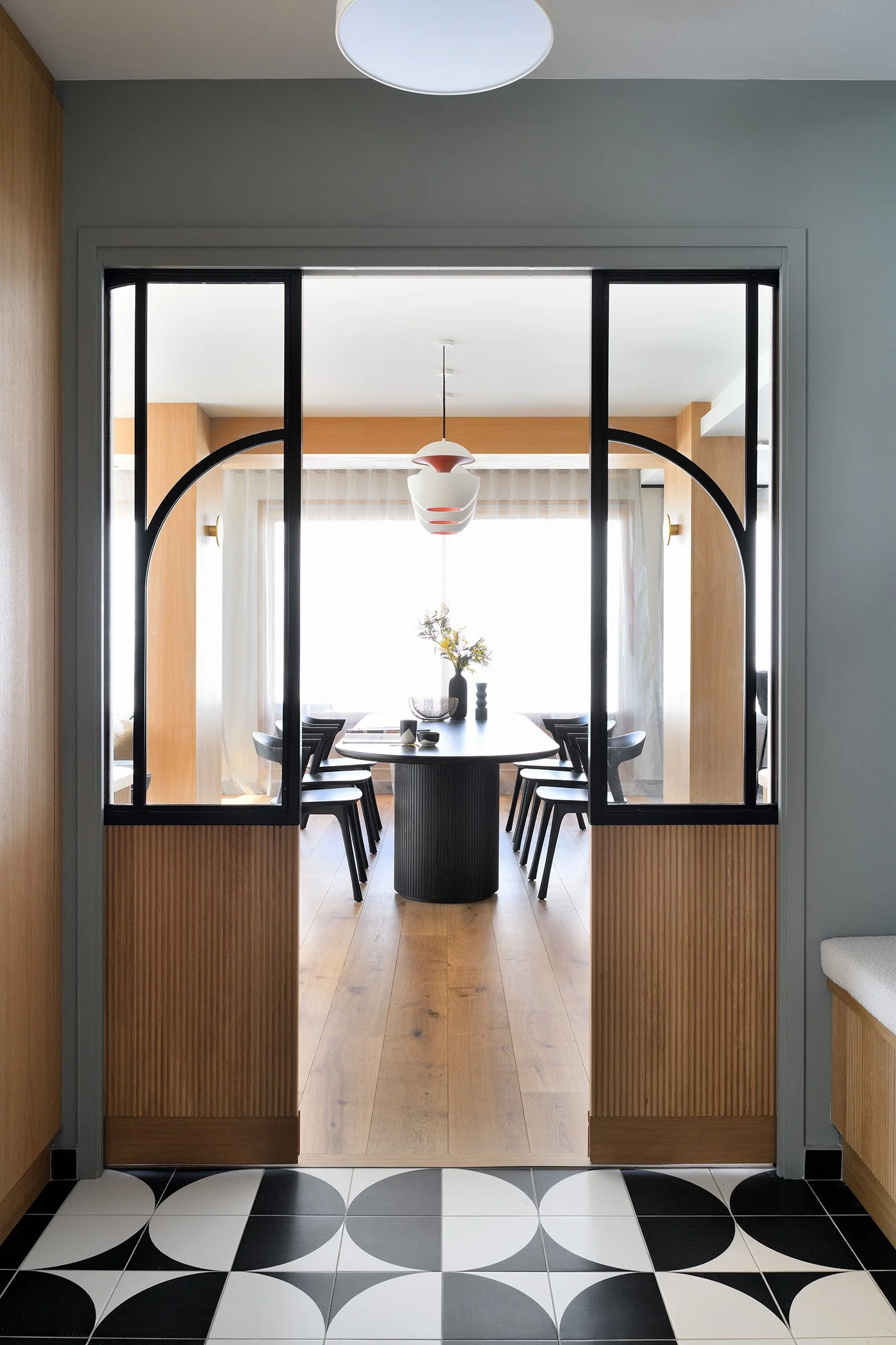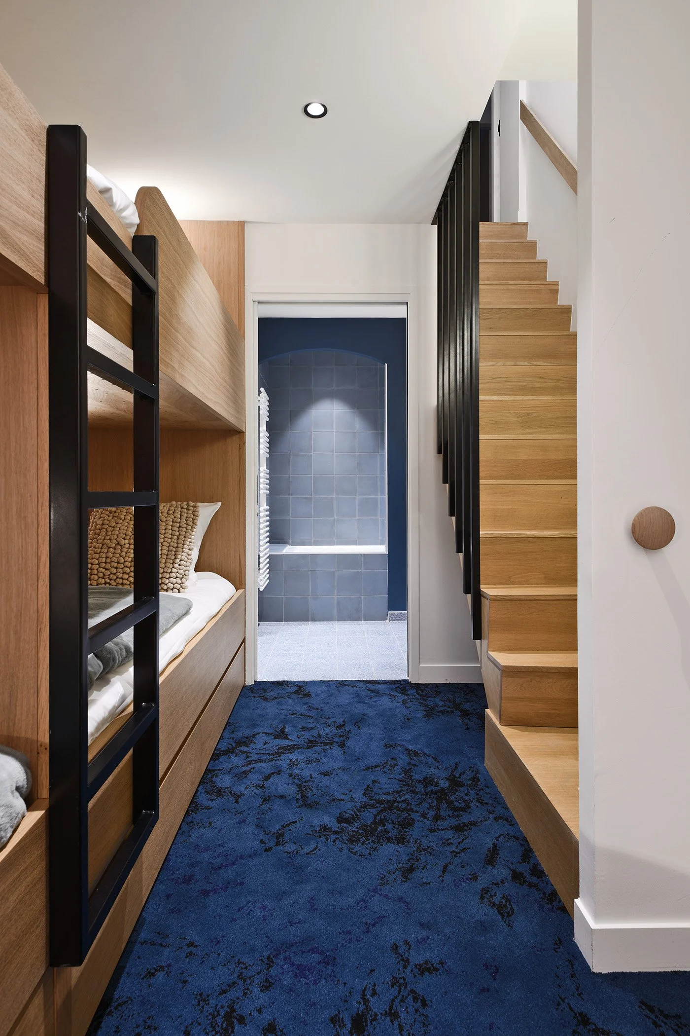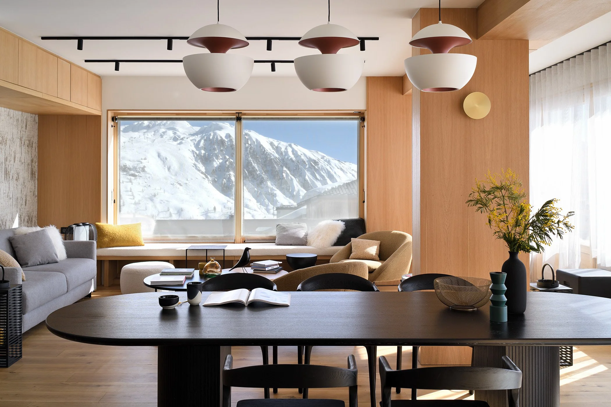 Les intérieurs alpins sont souvent synonymes de boiseries anciennes et d’atmosphères tamisées. Nous avons pris le contre-pied de cette vision en adoptant un ton résolument différent. Pour ce projet, notre approche du design mêle subtilement des éléments graphiques « art déco », des teintes claires et des textures minérales. L’agencement reflète quant à lui notre conception d’un intérieur épuré, où la lumière et le bois clair prédominent.