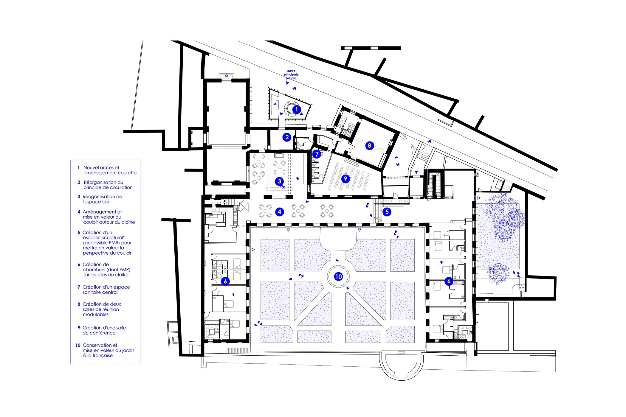 Notre intervention se concentre principalement sur la courette intérieure du côté de la rue de Rivault. Le mur à crénelage qui dessine la courette en limite de propriété est supprimé, afin d’y installer un espace d’accueil en rez-de-chaussée. Le parti pris architectural est celui d’un volume contemporain et sobre, ne faisant pas ombrage à l’existant. La composition simple et soignée permettra une insertion discrète dans la courette, mettant en valeur cet écrin propice à la méditation. En parallèle de ce projet d’extension, nous avons proposé une réflexion portant sur un nouvel aménagement intérieur de l’hôtel afin de fluidifier la circulation et l’orientation des futurs visiteurs.