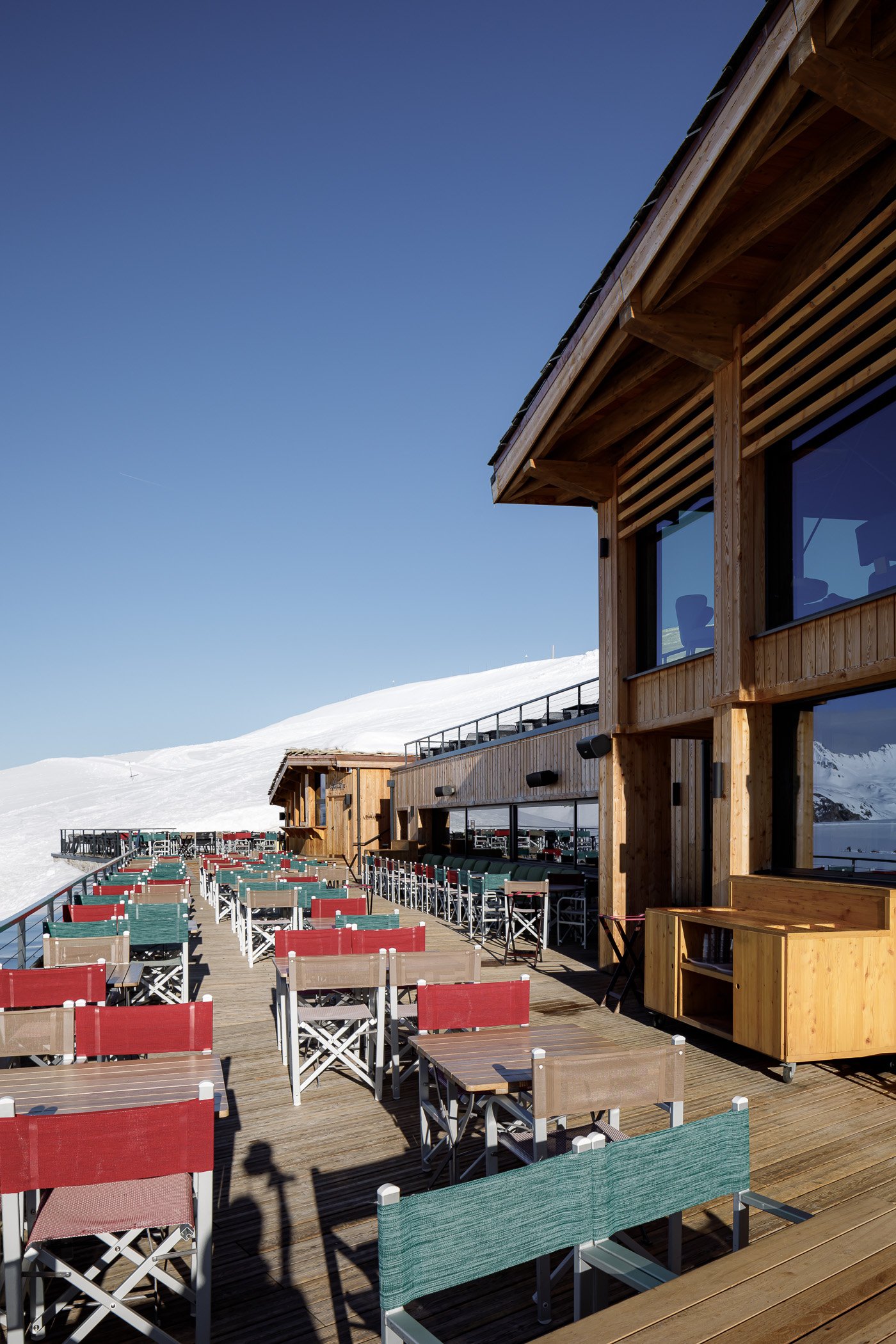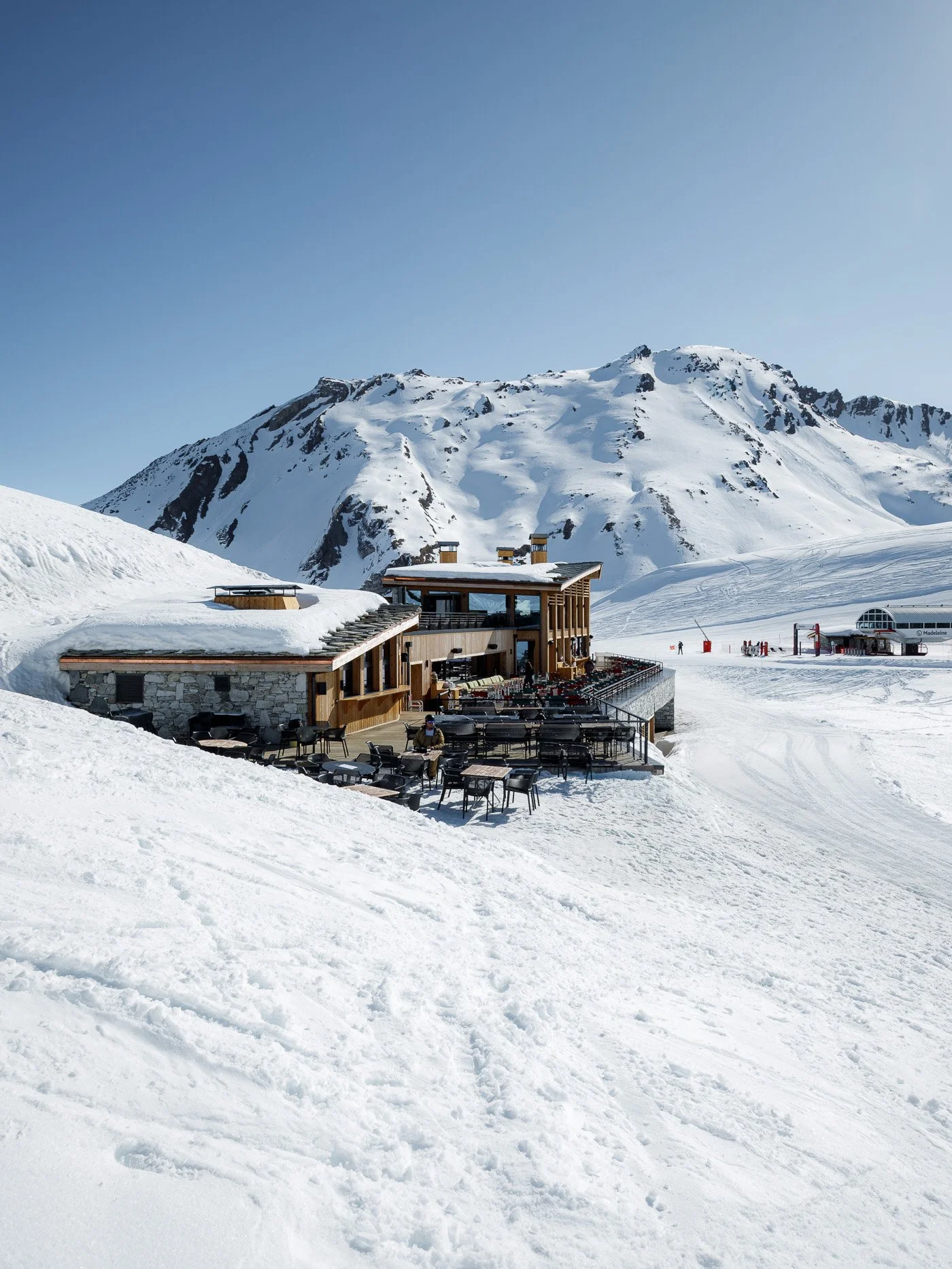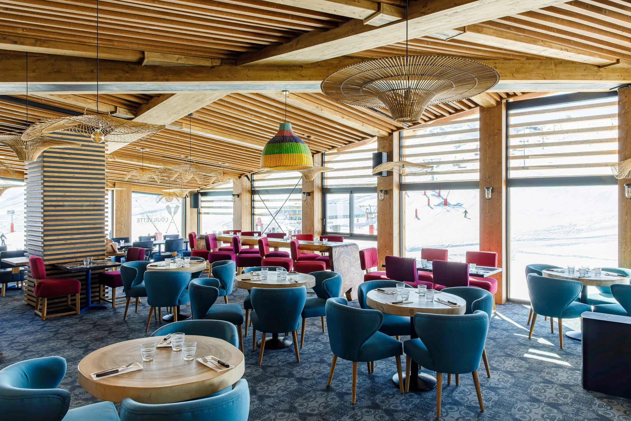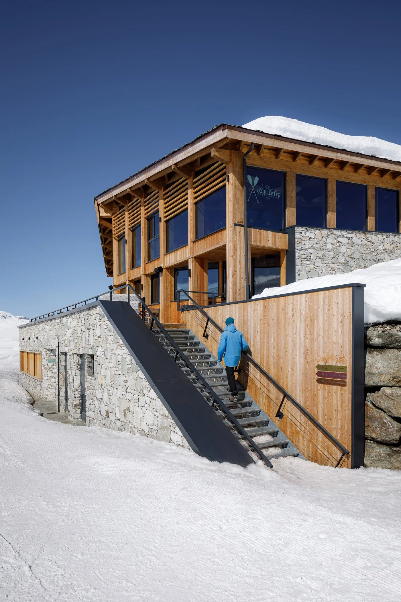 Face au lac de l’Ouillette, situé en haut du massif de Solaise et sur le domaine skiable de Val d’Isère, ce restaurant occupe une place privilégiée. Établissement emblématique situé au cœur d’une enclave préservée et légèrement à l’écart des remontées mécaniques, sa situation nous a guidés vers le choix de conserver l’esprit d’origine du bâtiment tout en lui offrant un visage plus contemporain. Le restaurant se développe dorénavant sur trois niveaux, s’ouvrant largement sur le panorama exceptionnel. Largement vitré, le restaurant du niveau haut est directement accessible depuis les pistes. Le niveau médian accueille le bistro et sa grande terrasse, espace signature des lieux et largement fréquenté depuis de nombreuses années. Le socle regroupe enfin tous les espaces de préparation et de stockage ; des coulisses spatialement généreuses améliorant grandement l’exploitation de l’établissement.