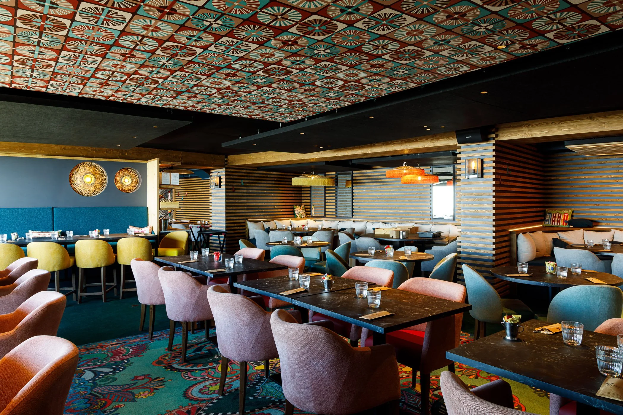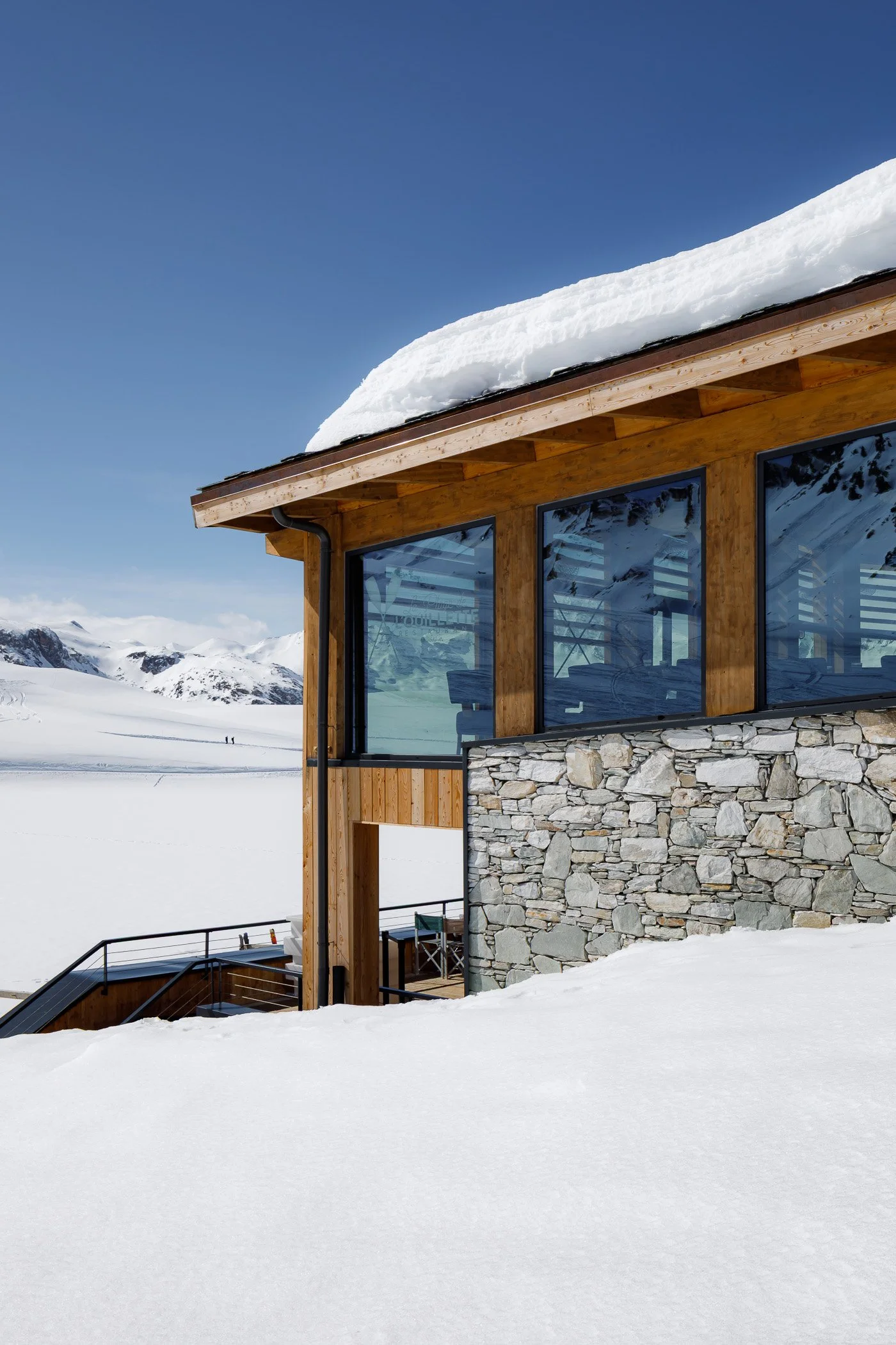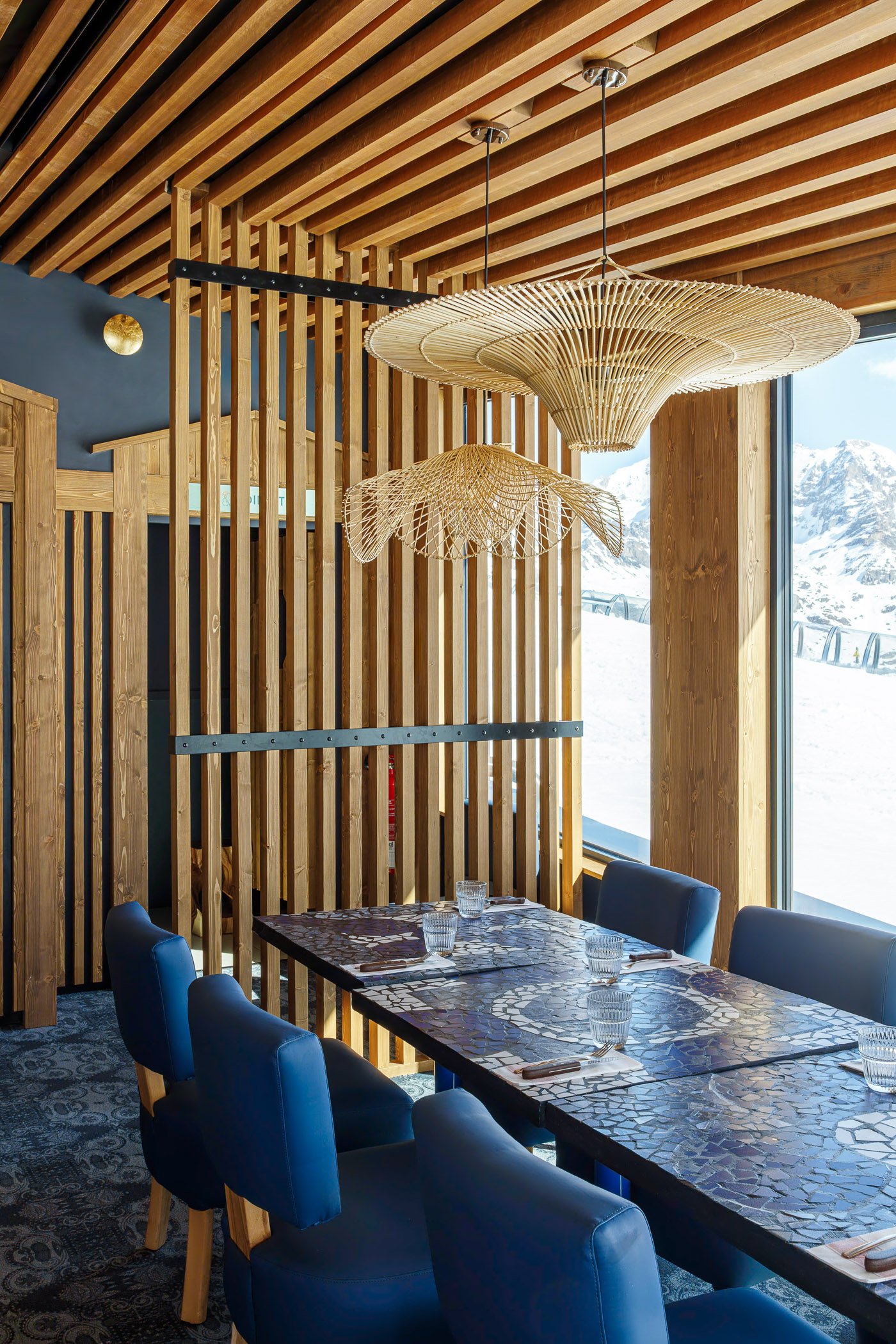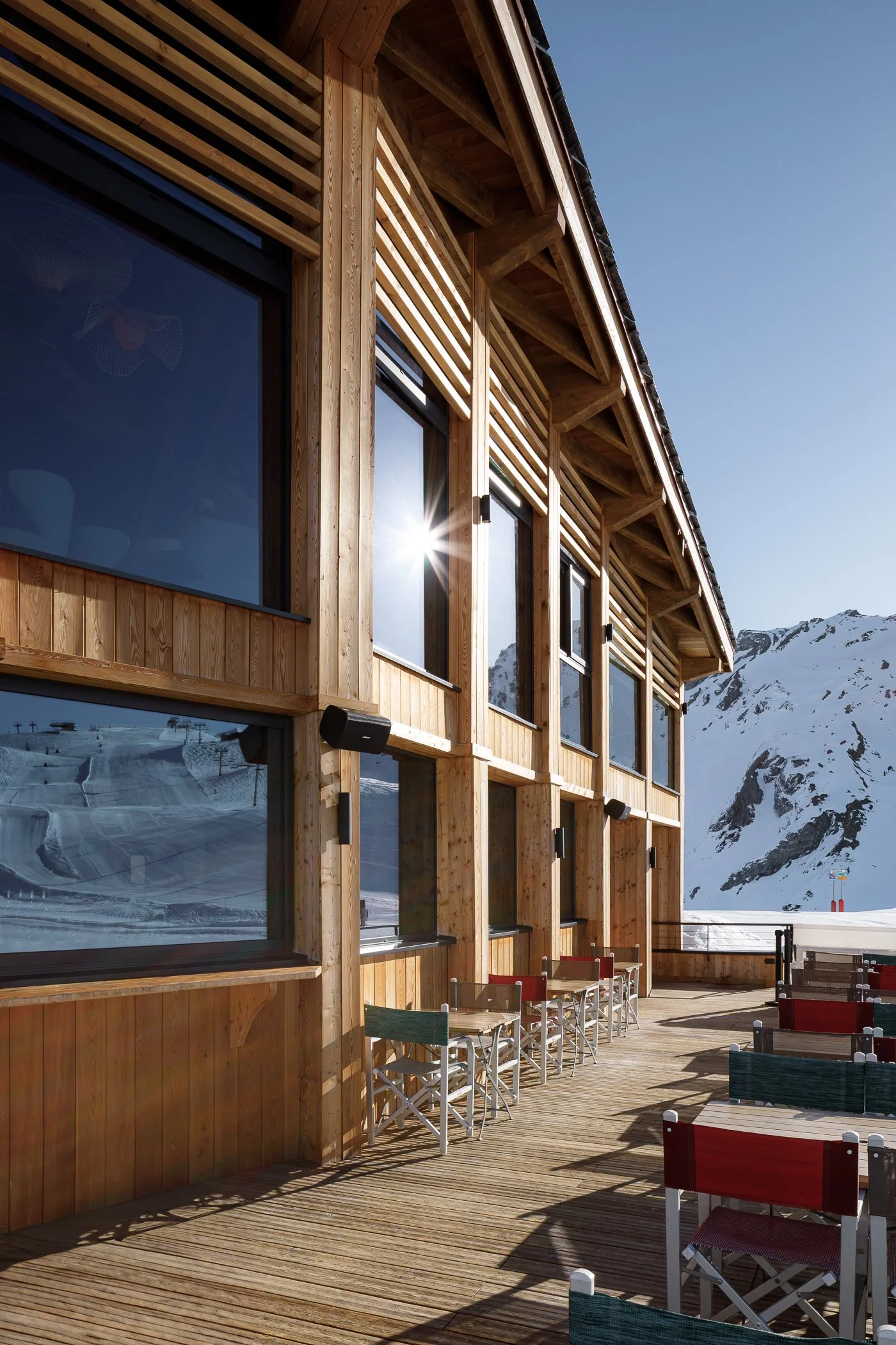 Face au lac de l’Ouillette, situé en haut du massif de Solaise et sur le domaine skiable de Val d’Isère, ce restaurant occupe une place privilégiée. Établissement emblématique situé au cœur d’une enclave préservée et légèrement à l’écart des remontées mécaniques, sa situation nous a guidés vers le choix de conserver l’esprit d’origine du bâtiment tout en lui offrant un visage plus contemporain. Le restaurant se développe dorénavant sur trois niveaux, s’ouvrant largement sur le panorama exceptionnel. Largement vitré, le restaurant du niveau haut est directement accessible depuis les pistes. Le niveau médian accueille le bistro et sa grande terrasse, espace signature des lieux et largement fréquenté depuis de nombreuses années. Le socle regroupe enfin tous les espaces de préparation et de stockage ; des coulisses spatialement généreuses améliorant grandement l’exploitation de l’établissement.
