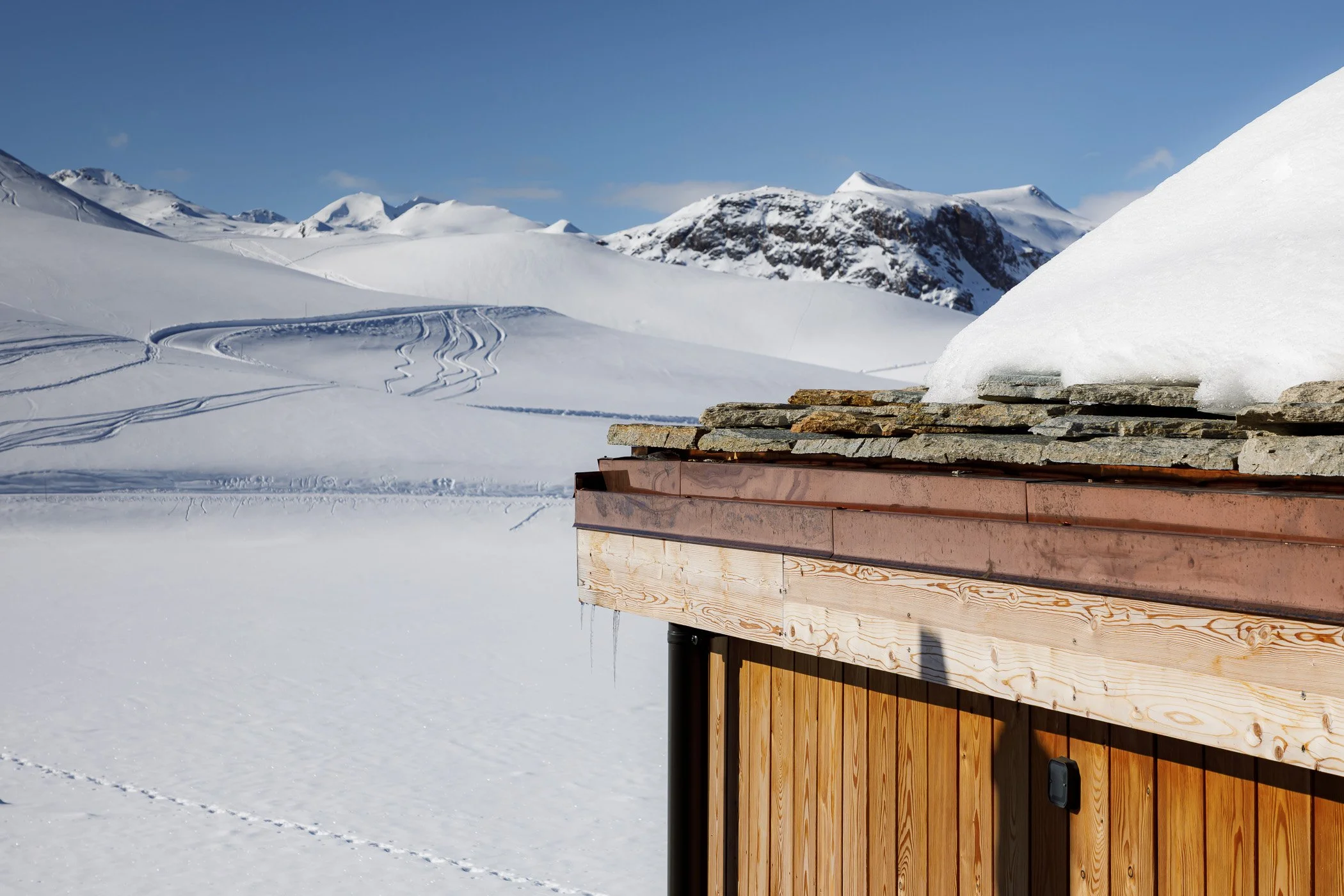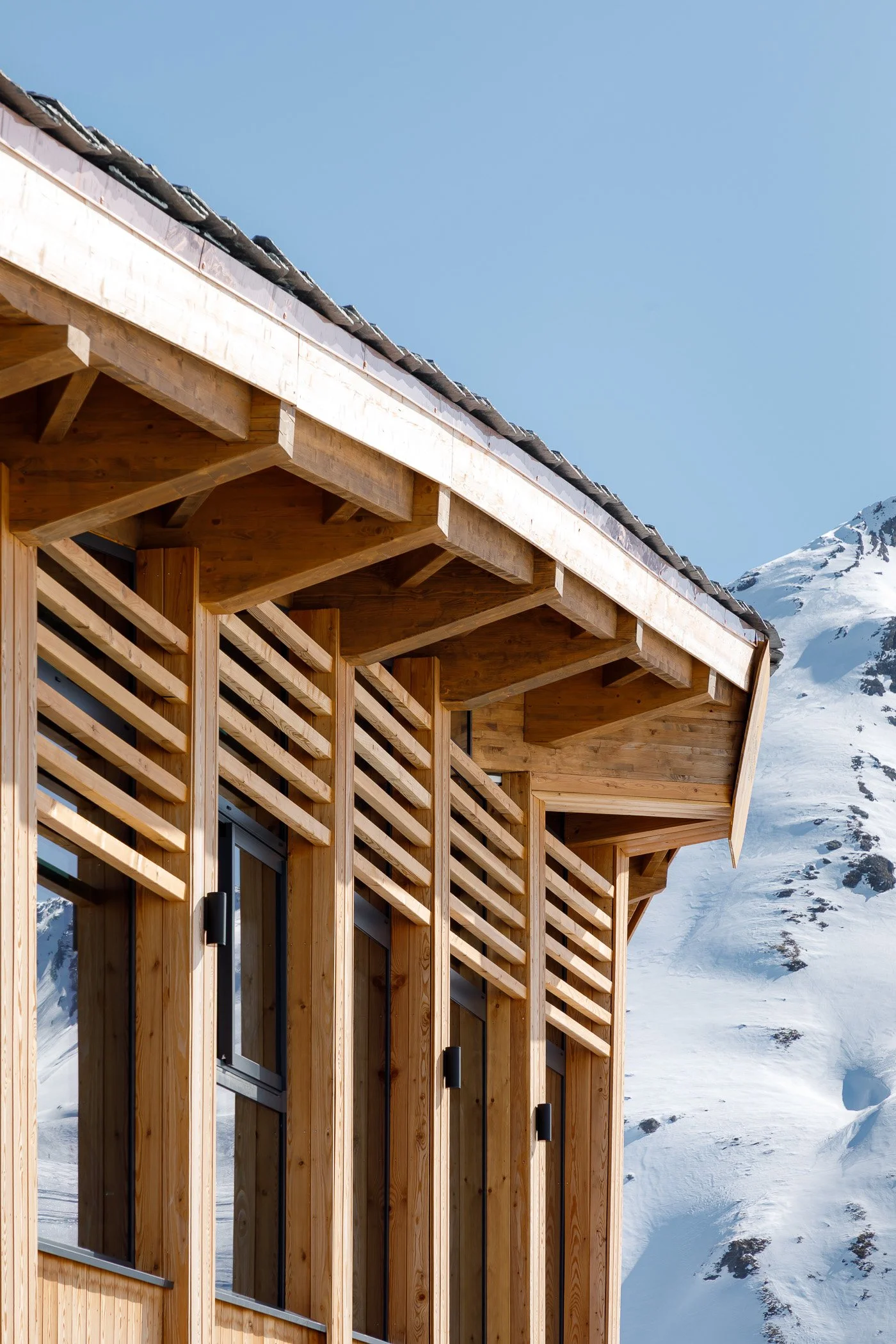 L’esthétique du projet répond au concept d’origine : un refuge d’altitude accueillant et ouvert sur l’extérieur. Les lignes épurées et le rythme des façades confèrent au projet une silhouette contemporaine, tout en jouant avec des expressions matérielles plus traditionnelles. Des éléments de détail précis contribuent à la singularité de cette construction : des pentes de toitures réduites apportant une certaine discrétion volumétrique, des garde-corps en câblage fin presque invisibles facilitant le déneigement, des claustras bois à hauteurs variables afin de gérer l’apport solaire et des descentes d’eau incorporées au parement pierre.